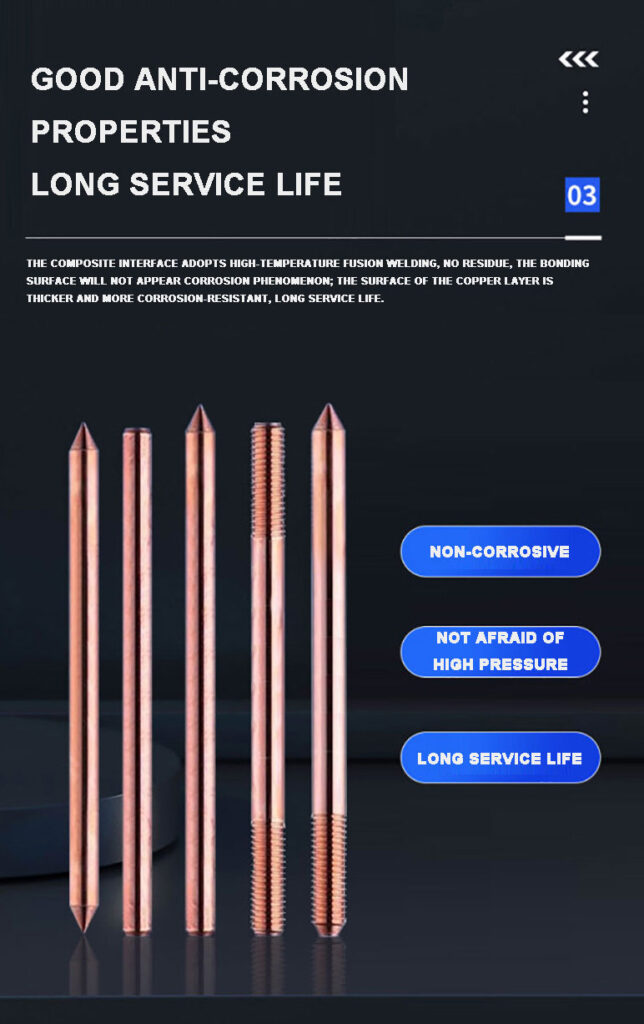 The dual-thread earth rod is equipped with coaxial connector, drive head and drill bit.The length of the cast copper ground rod can be arbitrarily increased.The driving head (connecting bolt) is used to connect the item end, which is used for striking when the rod is deep.The end is connected with a special bit (connecting bolt) to make it easier to hit the bar deep.